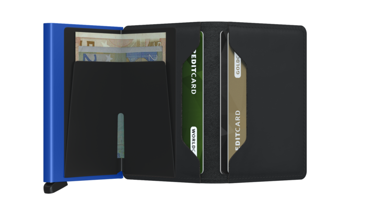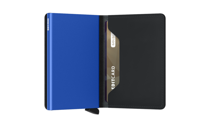 The Slimwallet Matte Black/ BLue is corrected-grain leather, made in Holland from European cowhide.
