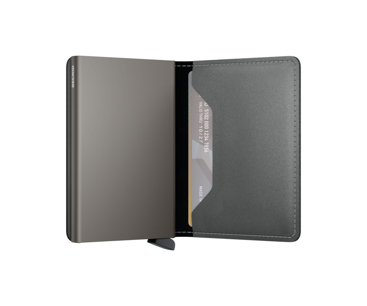 Its slim profile allows the Slimwallet to fit perfectly into any pocket. The open exterior is designed extra wide to accommodate cards, banknotes and receipts. The Cardprotector mechanism enables you to slide out cards with a simple motion, while the aluminium construction protects your cards from bending, breaking and unwanted wireless communication.