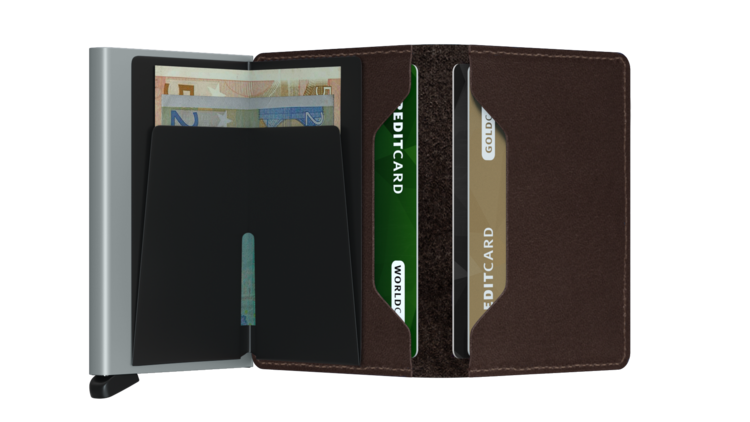 The patented mechanism allows you to slide out your cards with one simple motion, ready for immediate use. The aluminium protects from bending, breaking and unwanted wireless communication.