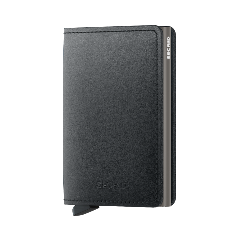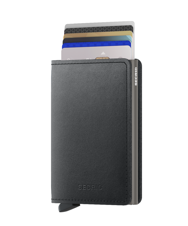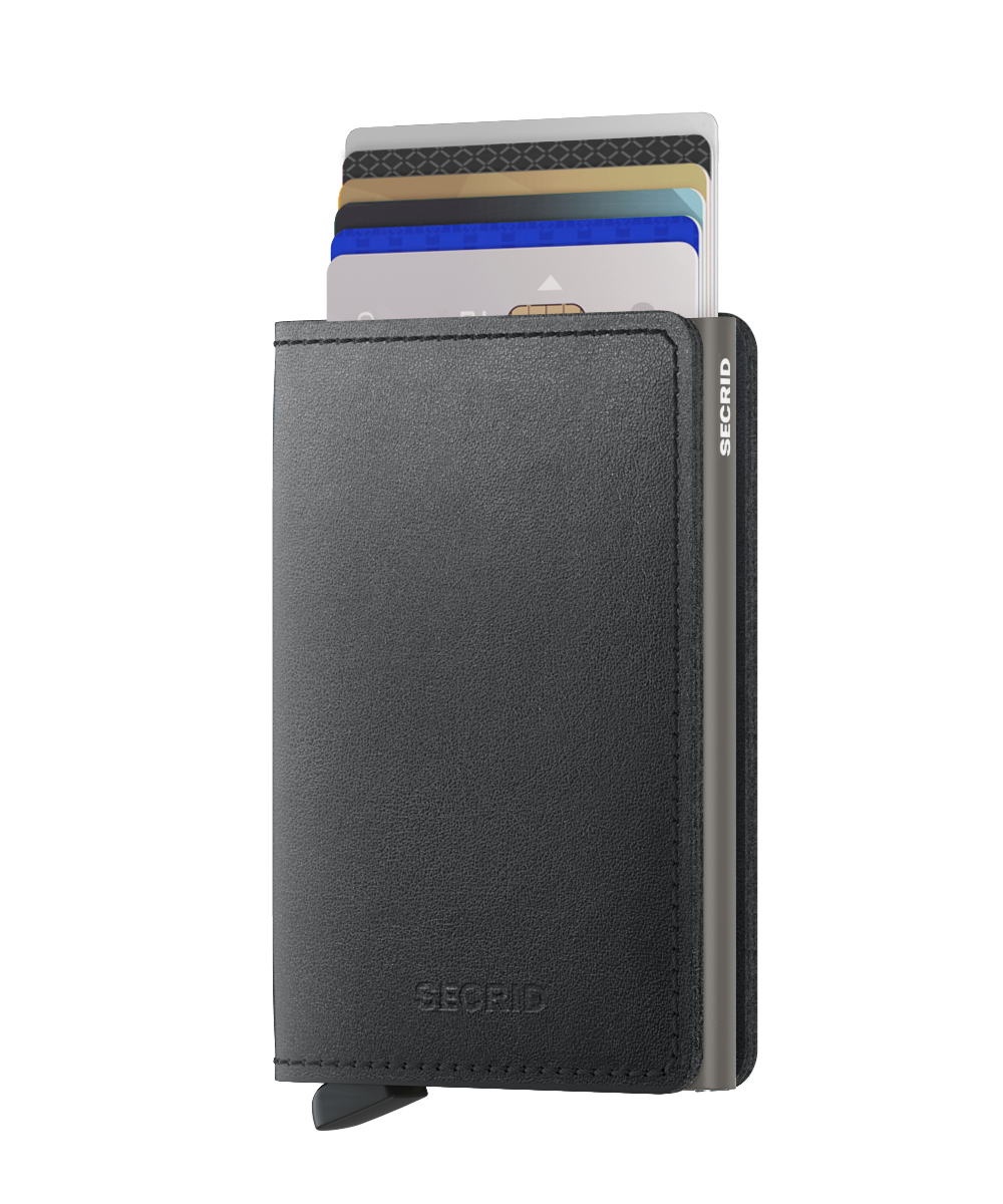 SlimwalletThe Slimwallet is a modern upgrade from the classic bi-fold wallet. It has a slim profile and the generously cut leather holds at least an additional six cards, banknotes and business cards.The patented mechanism allows you to slide out your cards with one simple motion, cascading and ready for immediate use. The aluminum protects from bending, breaking and unwanted wireless communication (RFID protection).
