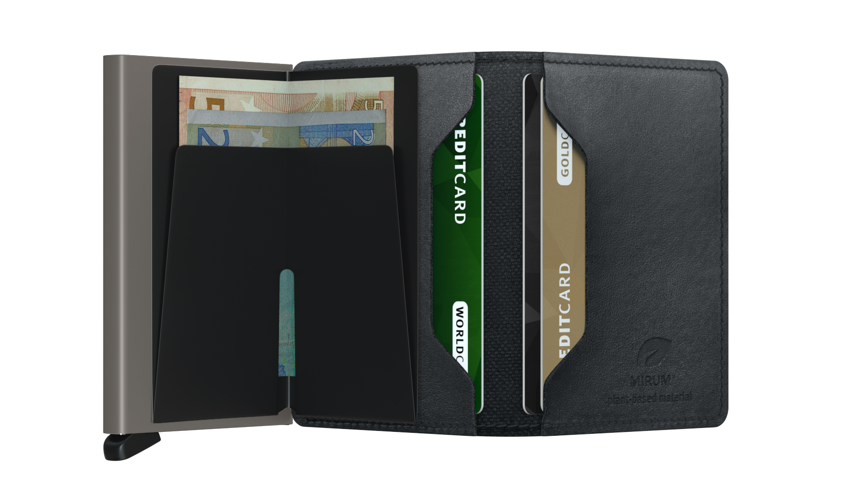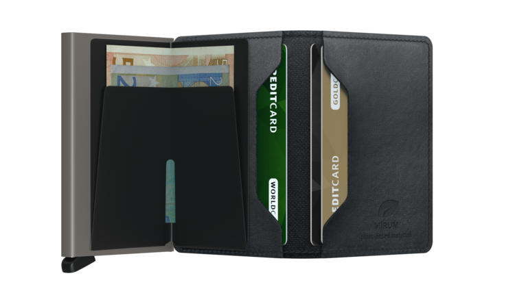 Mirum Plant-Based MaterialFeatures a patented non-leather finish. Quality reassured by UL Solutions, a safety organisation that sets industry-wide standards for new products. This wallet is cut and stitched in the Netherlands.
