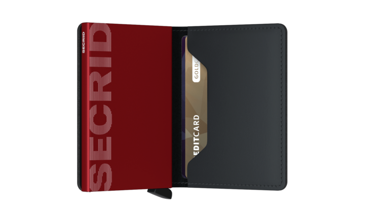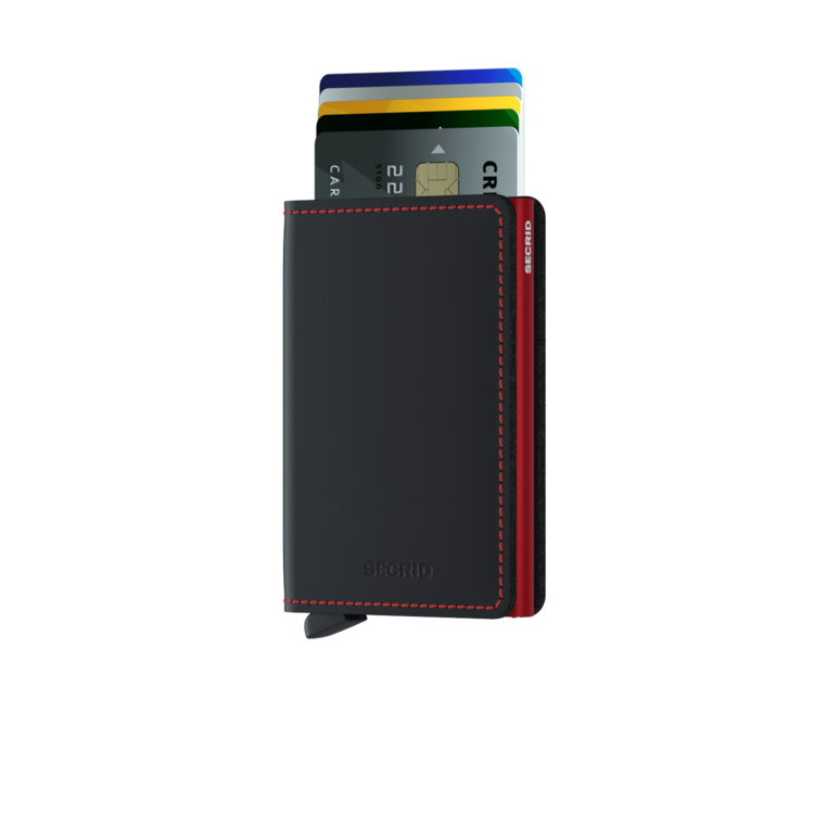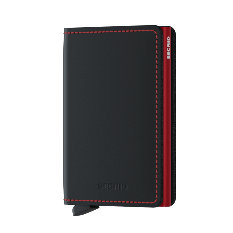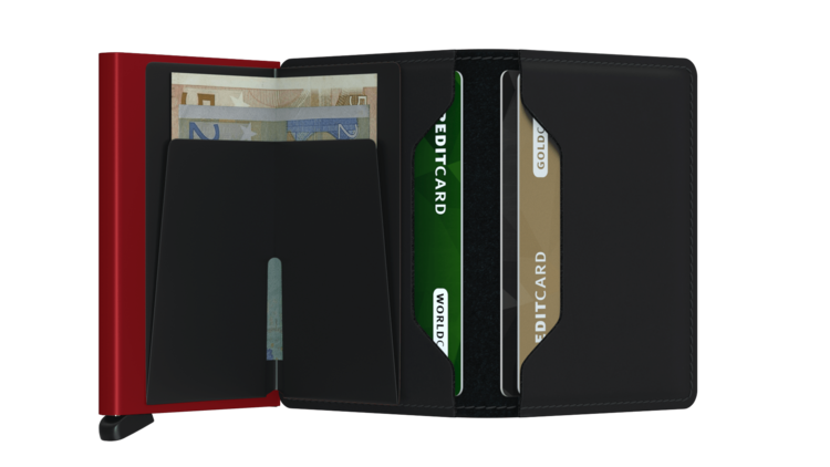 Slimwallet Matte Black & Red is corrected-grain leather, made in Holland from European cowhide.