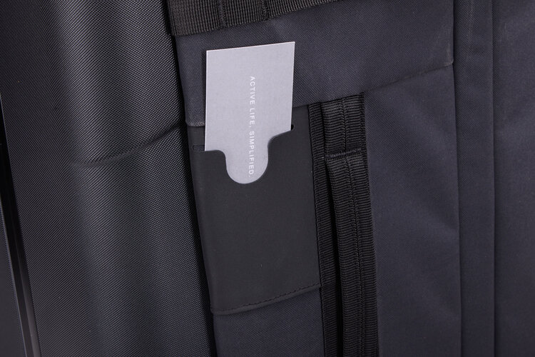 Outer shell fabric and lining are made of 100% recycled polyester from recycled plastic bottles, while the polycarbonate back panel is made of 50% recycled material