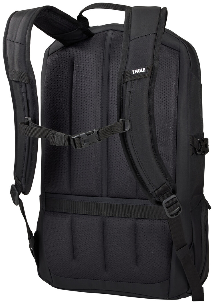 Sternum strap, padded back panel with airflow channel, and side compression straps to balance the load, making it more comfortable to carry