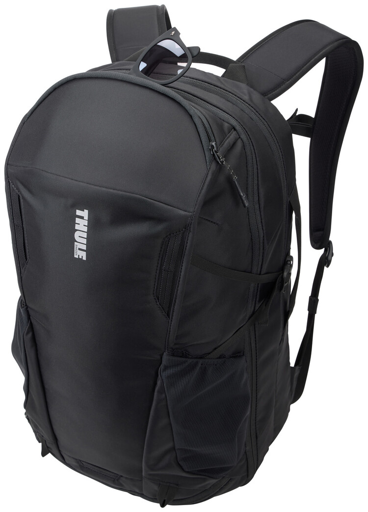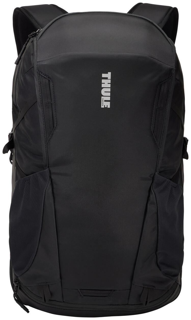 Mesh exterior side pockets stretch to hold a water bottle, power brick or umbrella