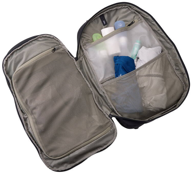 Backpack unzips completely to pack both sides easily and has a bulk storage compartment with a mesh panel that zips closed to hold items in place