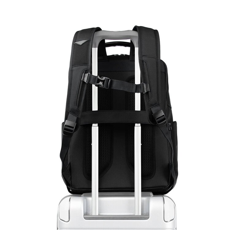 When it’s time to move, the padded airflow back panel and adjustable, padded shoulder straps provide superior comfort and a dedicated strap pocket for earbud storage. For hands-free mobility, an unobtrusive rear stacking strap fits around the extension handle of any Rollaboard® or spinner suitcase.