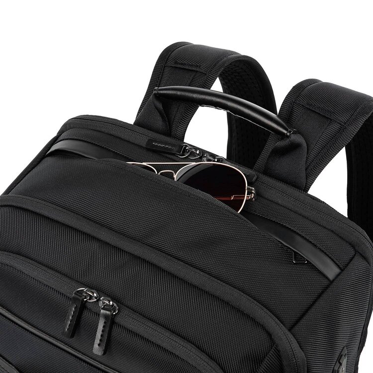 Crafted with high-quality, stain-resistant nylon fabric and leather accents, this backpack is loaded with convenience features, including a Travelpro® ID TheftBlock™ pocket that protects credit cards and passports from loss and identity theft, the Travelpro® QuickSlip™ front pocket with magnetic closure for quick-access cell phone storage, a tricot-lined, exterior top-zip sunglass pocket and exterior, lie-flat side pockets that expand to hold water bottles or an umbrella.