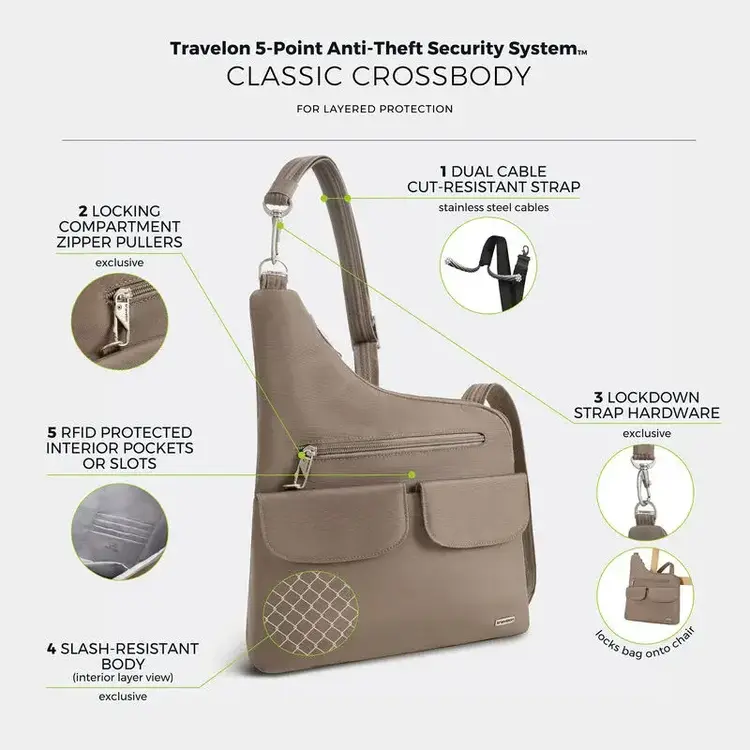Timeless classic style with everyday dependability — Classic is the original Travelon Anti-Theft collection that shaped the category. Loved for its reliability, sleek silhouettes, and smart design, these bags weather countless journeys while staying versatile enough for everyday life. Each bag carries more than your essentials — it carries 100% peace of mind.