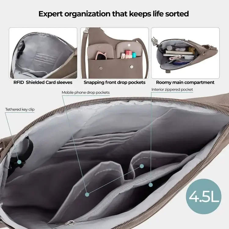 •SMART ORGANIZATION RESTORES ORDER — Life is chaotic, your bag shouldn’t add to it. Purposeful organization creates calm, keeping essentials where you expect them to be. Front zip pocket for tickets, two magnetic flap-over pockets. A 4.5L main compartment has RFID card and passport slots, 2 drop pockets, a large zippered pocket, and tethered keyclip. A rear zip pocket keeps important items close. Make this bag function like a personal assistant—so you stay focused, efficient, and ready.