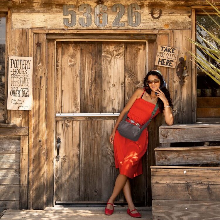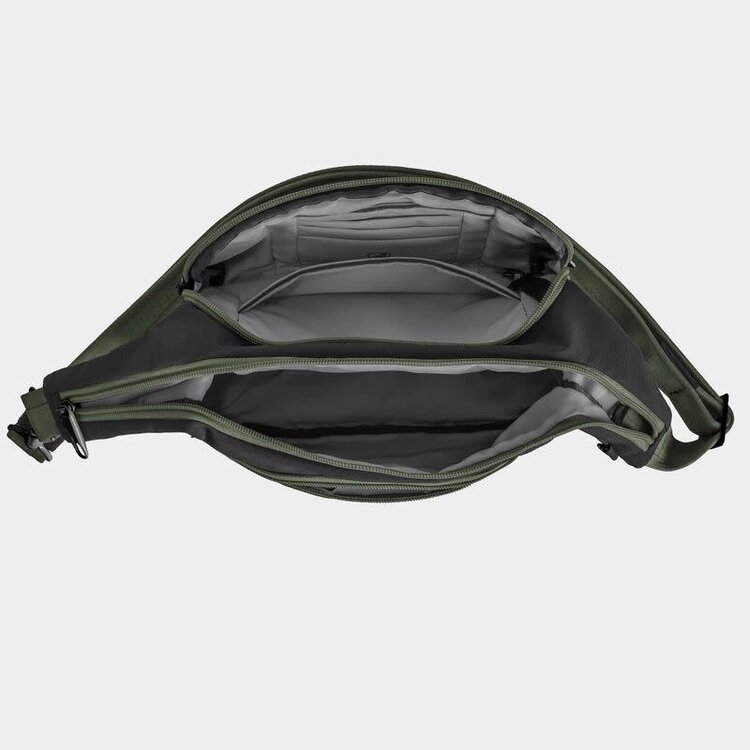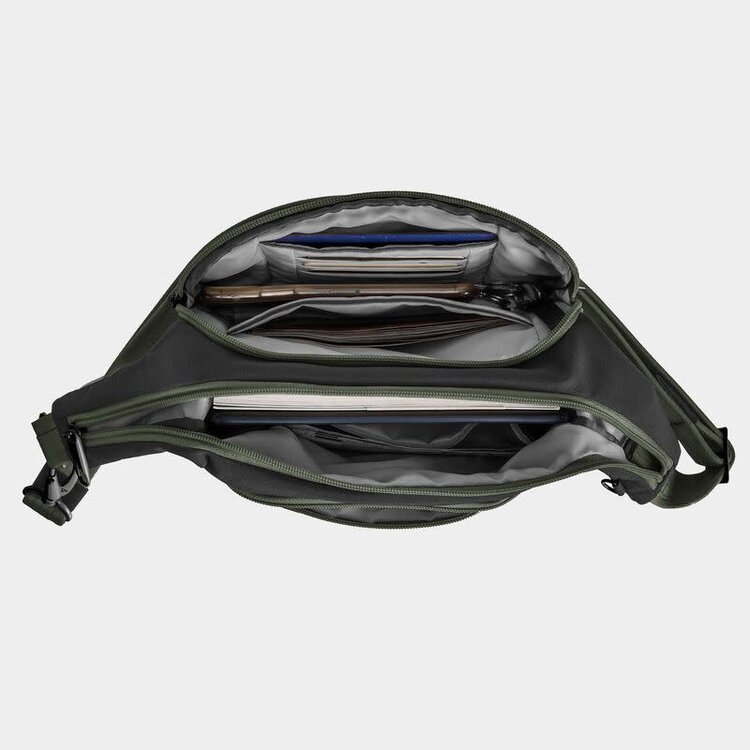 This modern Anti-Theft East/West Crossbody holds a DSLR camera and lens, and provides the convenience of hands-free travel that makes bustling markets or an adventure hike worry-free. Blending style, durability, safety features on every side, premium organization, slash-resistant and lightweight (only 0.85 lbs) performance materials, combined are a game changing experience.