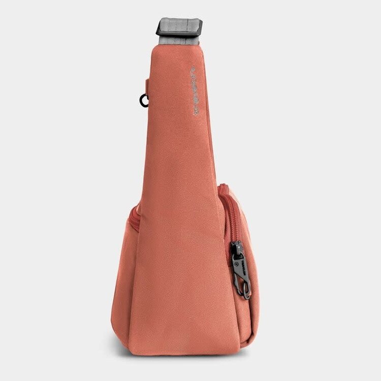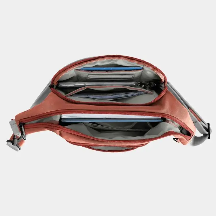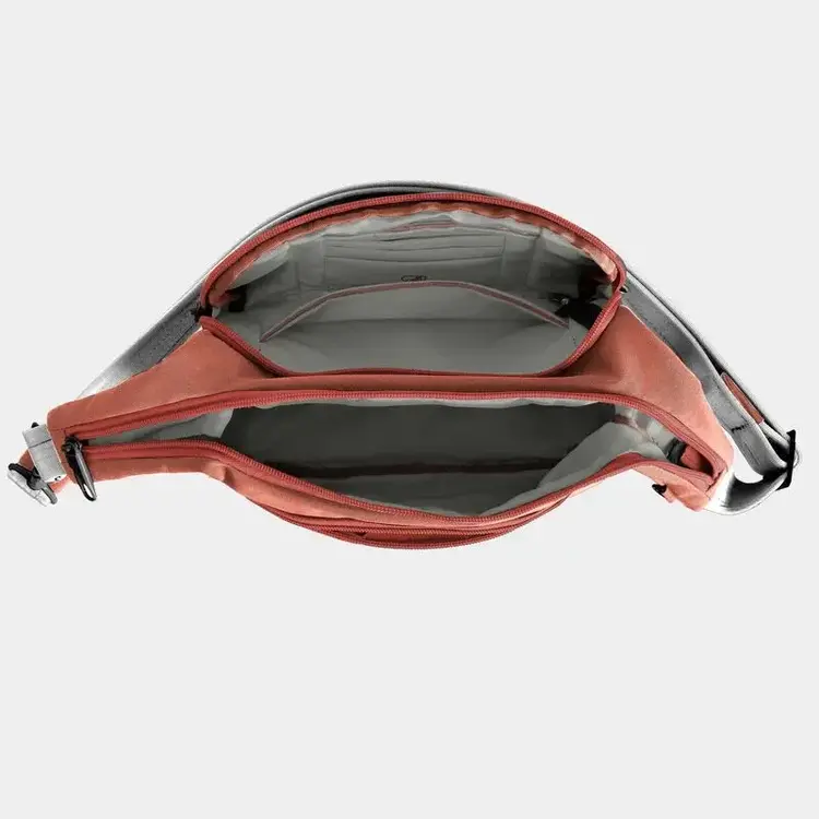 This modern Anti-Theft East/West Crossbody holds a DSLR camera and lens, and provides the convenience of hands-free travel that makes bustling markets or an adventure hike worry-free. Blending style, durability, safety features on every side, premium organization, slash-resistant and lightweight (only 0.85 lbs) performance materials, combined are a game changing experience.