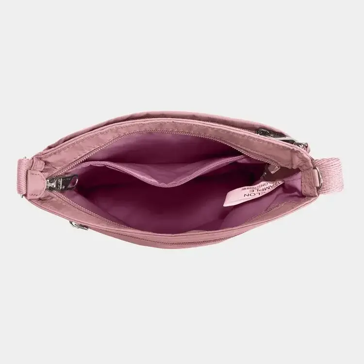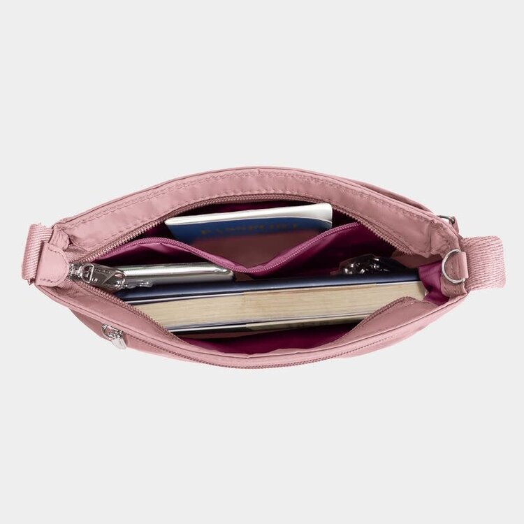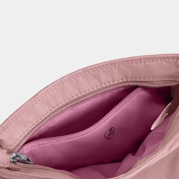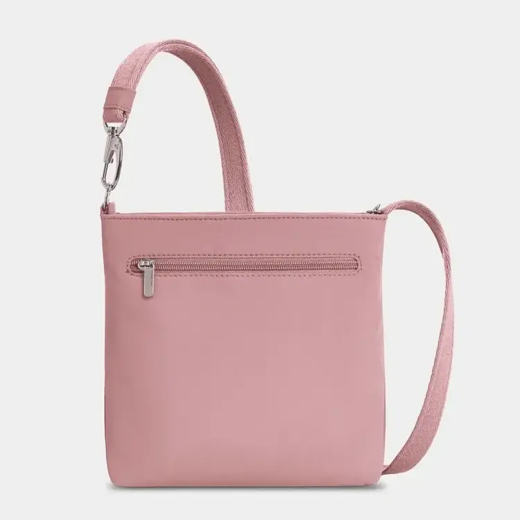 • A stylish front shows a slash pocket and a locking pocket. In the rear you’ll find a clever hidden zippered pocket for items and documents you want to hold close. Soft to the touch nylon bag is also highly durable yet ultra-lightweight so it won’t slow you down.