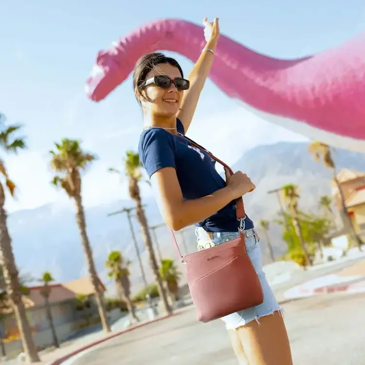 Roam at-ease, and hands-free! This Small Crossbody has a built-in 5-Point Anti-Theft security system with: a slash-resistant body and straps; Locking compartments; Lock-down hardware and RFID blocking pockets and slots, for passports and cards, prevents thieves from breaking into, snatching your bag, or scanning your identity.
