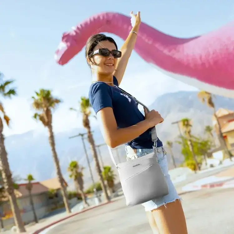 Roam at-ease, and hands-free! This Small Crossbody has a built-in 5-Point Anti-Theft security system with: a slash-resistant body and straps; Locking compartments; Lock-down hardware and RFID blocking pockets and slots, for passports and cards, prevents thieves from breaking into, snatching your bag, or scanning your identity.