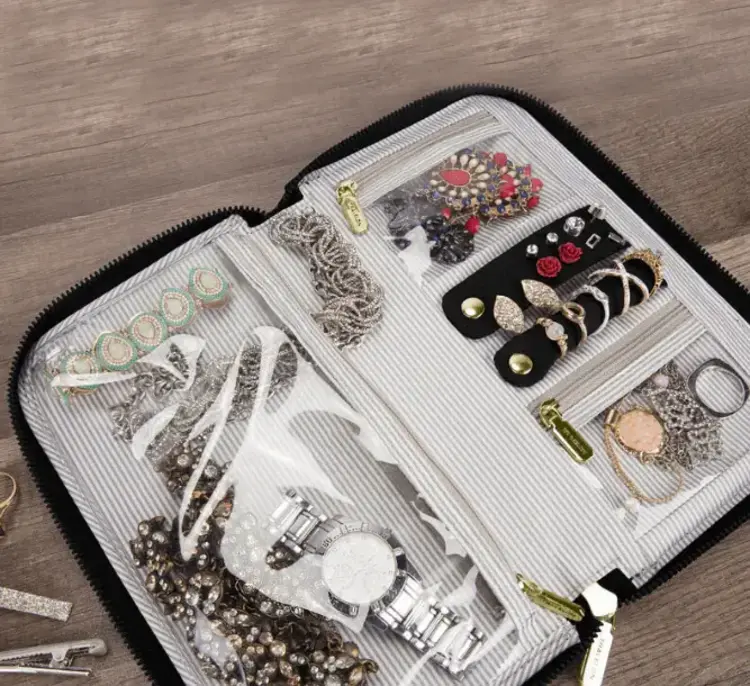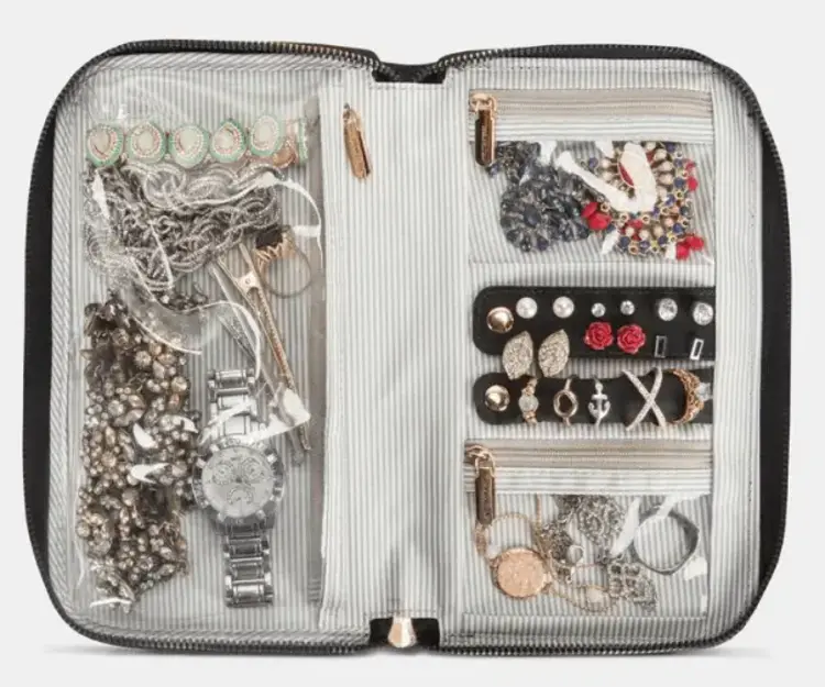 • Keep treasures organized and protected in the Travelon Jewelry Case. Features compartments for all your favorite baubles. A zip closure keeps everything neatly tucked inside. Fits it in a purse or suitcase.