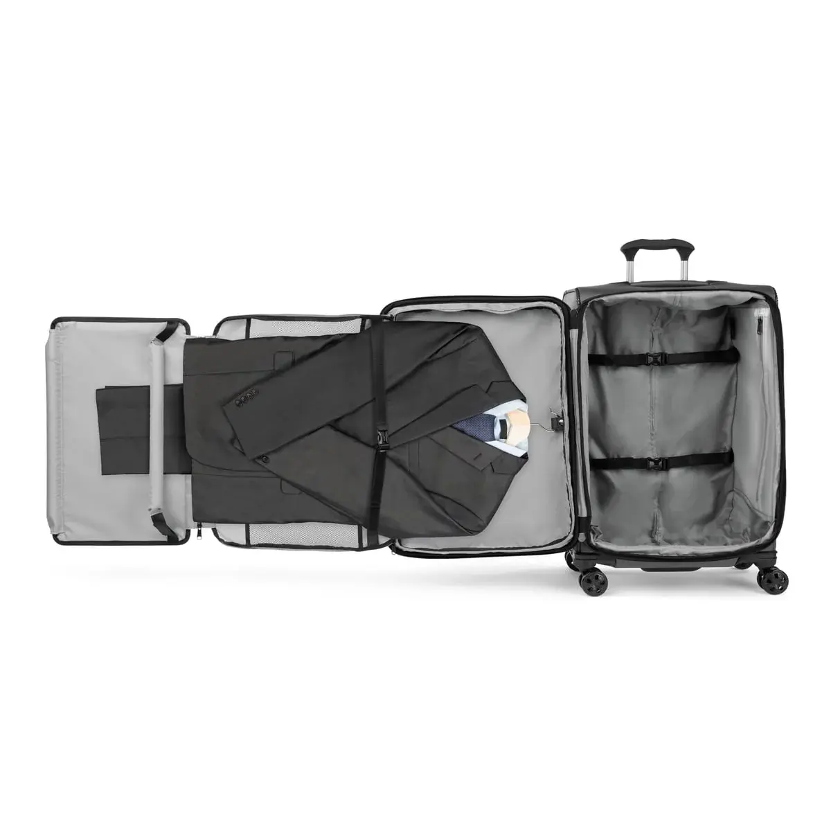 Arrive without a crease using the removable fold-out suiter, designed to protect hanging clothes from wrinkles. Interior hold-down straps, water-resistant storage, and multiple accessory pockets add organization, keeping everything where it belongs and easy to find.