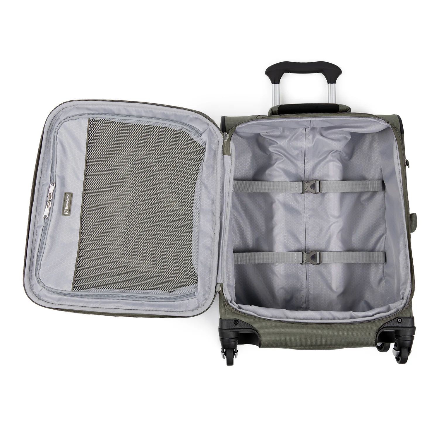 As a stand-alone or as a complement to your checked baggage, the Maxlite® 5 19-inch International Expandable Carry-On Spinner is sized to meet most international cabin standards with extra space to spare thanks to its useful zippered expansion feature that provides up to 2 inches of additional packing capacity. Ideal for short- to medium-length trips, this indispensable travel bag features a dual-position adjustable PowerScope Lite handle with patented comfort Contour Grip and four 360° Spinner wheels for effortless mobility in any direction. Compact and lightweight, yet sturdy and durable, this stylish suitcase comes equipped with two convenient zippered front pockets, a full-length interior lid pocket, a side accessory pocket, and a roomy interior with adjustable tie-down straps to keep your packed items securely stowed.