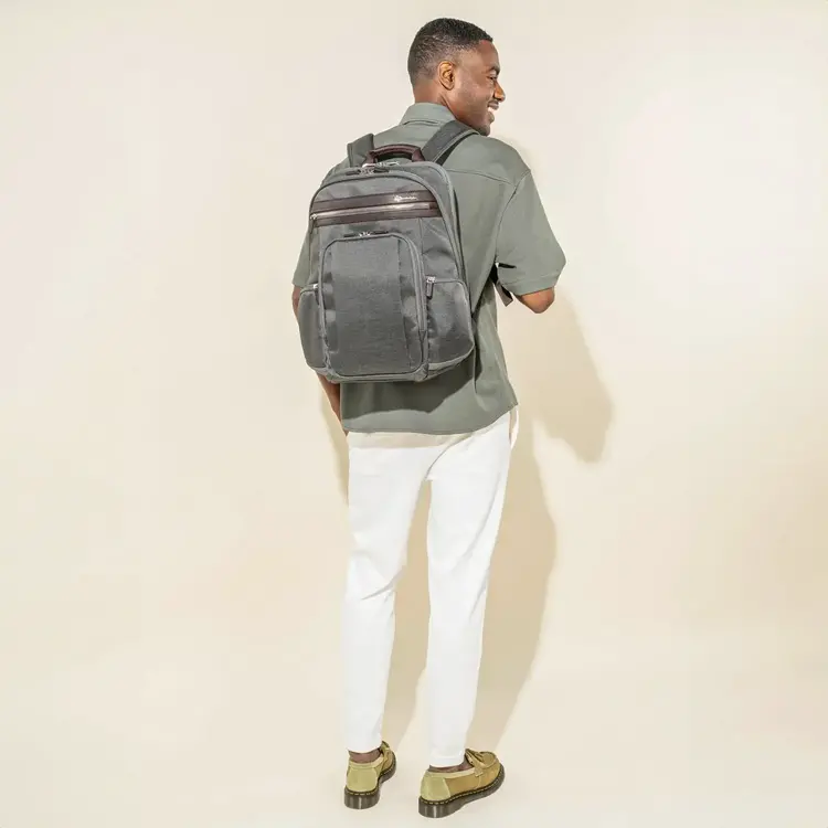 Constructed for frequent and lasting use, this backpack has ECOFAB™ interior lining that is easy to clean and made from recycled plastic bottles, and ultra-durable, high-density exterior fabric that is treated to resist stains and abrasions. Full-grain leather touches add sophistication and hardy YKK® zippers stay on track and glide with ease.