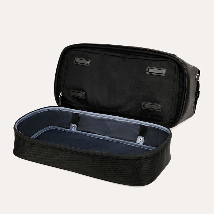 Carrying options include leather handle touchpoints, a removable, adjustable shoulder strap, and an integrated rear strap that slides over the extension handle of a rolling suitcase for secure stacking.