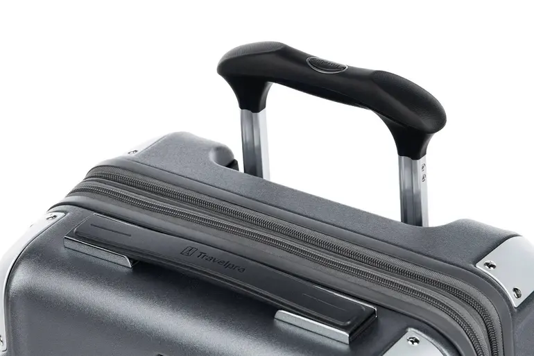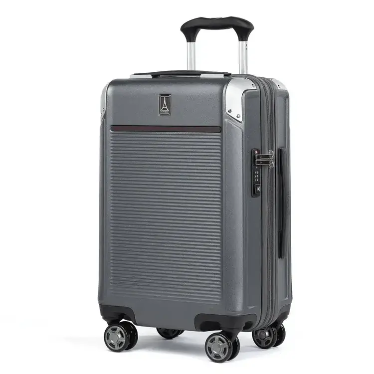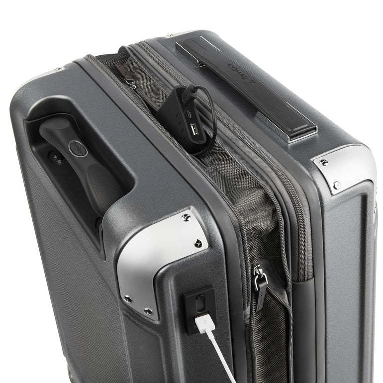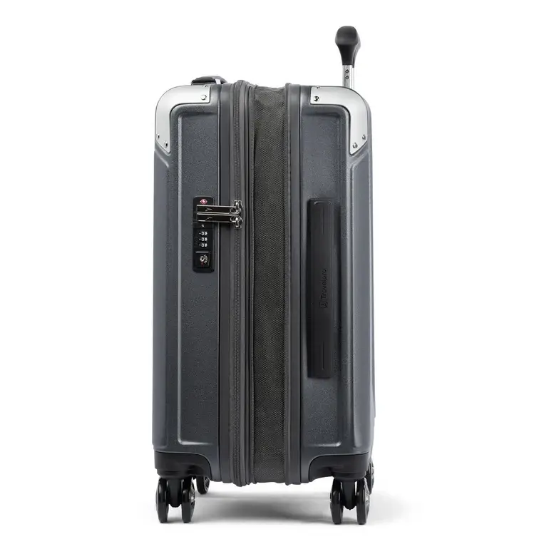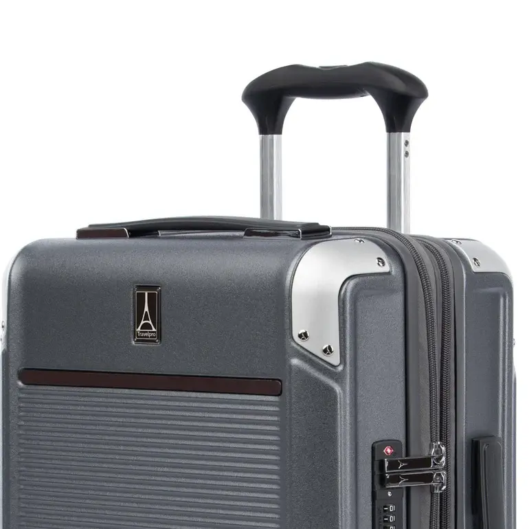 The Platinum® Elite Carry-on Expandable Hardside Spinner is as stylish as it is durable and practical. It has all the modern conveniences you could want in a carry-on and adapts to give you more packing space when needed. You can power your electronics on the go thanks to the external USB A & C ports that have fast-charge capabilities as well as the dedicated external-access pocket that provides FAA-compliant storage for your charger. With dimensions that fit in the overhead bins of most major Canadian airlines, this carry-on also has a zippered 2” expansion feature to increase your packing capacity when needed.This hardside carry-on spinner is durably constructed with a 100% polycarbonate shell that is ultra-strong, easy-to-clean and flexes upon impact to prevent cracks and keep contents protected. It also has a textured finish that helps to reduce the visibility of scuffs and scratches. Details such as the genuine leather trims and the aluminum corners give the carry-on a sophisticated look and help protect the areas from wear and tear. The built-in TSA-approved lock allows authorities to have easy access when needed.Inside, the clamshell design has two zippered divider panels that make it easy to organize your belongings and keep everything securely in place. Multiple pockets give you a ton of organizational space and a water-resistant pocket allows you to keep your damp items or toiletries separate.When travelling, this carry-on gives you precise control and effortless roll with its Travelpro® exclusive PrecisionGlide™ System–eight MagnaTrac® self-aligning spinner wheels and its four-stop adjustable PowerScope Lite handle that has a comfortable Contour Grip.