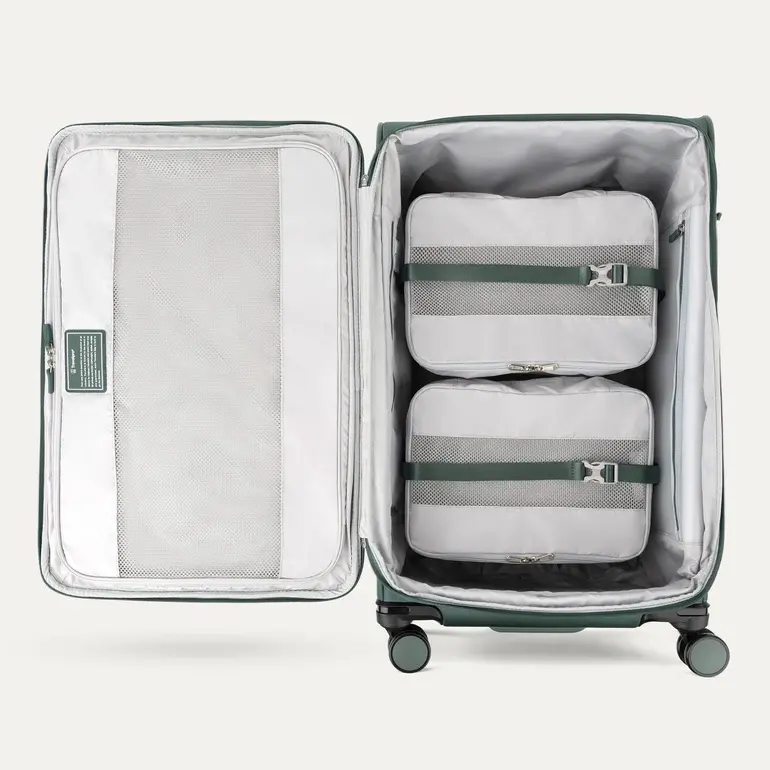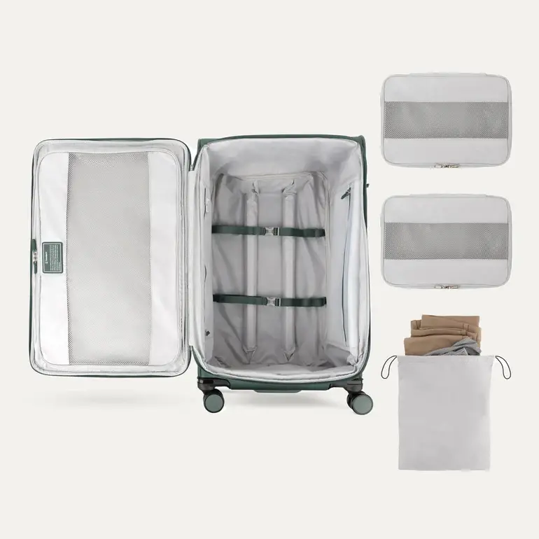 Designed to meet checked luggage size restrictions for most airlines, the durable VersaPack®+ Large Check-in Expandable Spinner gives you ultimate packing versatility with advanced features that maximize capacity and keep all contents organized and secured. Two removable large packing cubes and built-in interior pockets make the most of your packing space, while a removable laundry bag and built-in wet pocket separate damp or soiled items from everything else.
